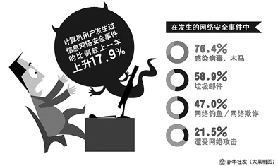 計(jì)算機(jī)用戶發(fā)生過信息網(wǎng)絡(luò)安全事件的比例較上一年上升17。9%,感染病毒、木馬仍然是用戶面臨的最主要威脅。