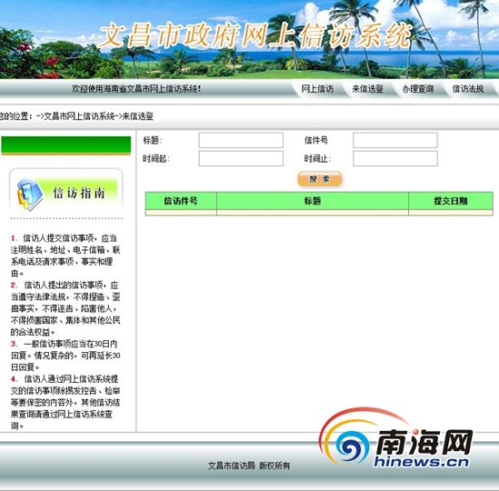 文昌市政府網(wǎng)站網(wǎng)上信訪(fǎng)系統(tǒng)空空如也,無(wú)任何投訴信息。(圖片來(lái)源:文昌市政府網(wǎng)站截圖)