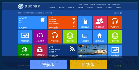 初次登錄時網(wǎng)站會提醒用戶選擇哪種版本,選擇導(dǎo)航版就會進入Windows 8風(fēng)格的網(wǎng)站,而我們也在該頁面的地址中發(fā)現(xiàn)了“win8”的字樣。與此前其他類似風(fēng)格的政府網(wǎng)站不同,佛山市氣象局網(wǎng)站的磁貼是可以自己隨意排列位置的,這一點倒是和Windows 8挺像。