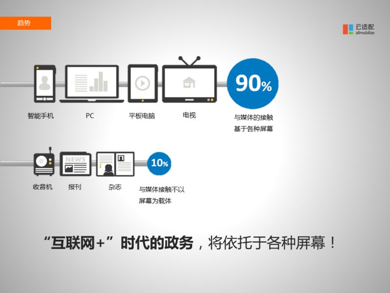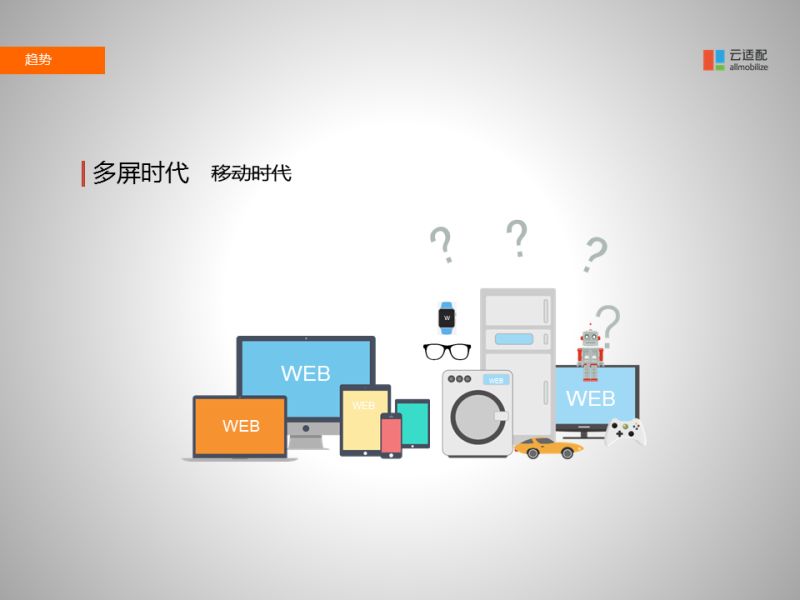 大家現(xiàn)在都叫移動(dòng)互聯(lián)網(wǎng),但是在云適配的眼里,"移動(dòng)互聯(lián)網(wǎng)"的叫法已經(jīng)過時(shí)了,未來我們將會進(jìn)入一個(gè)新的時(shí)代,叫"多屏互聯(lián)網(wǎng)"時(shí)代,因?yàn)槲磥砘ヂ?lián)網(wǎng)會接入的設(shè)備不僅僅是手機(jī),還會有汽車、手表、眼鏡等等。我們今天已經(jīng)看到有各種各樣的智能設(shè)備接入互聯(lián)網(wǎng),而且人們也正在使用各種各樣的設(shè)備從互聯(lián)網(wǎng)上接收信息。所以政府在做移動(dòng)化、信息化的過程中,不僅僅是考慮電腦、手機(jī),更重要的是考慮更長遠(yuǎn)的:各種各樣的屏幕, 未來可能就是在汽車上、手表上、眼鏡上接收政府宣傳的信息。