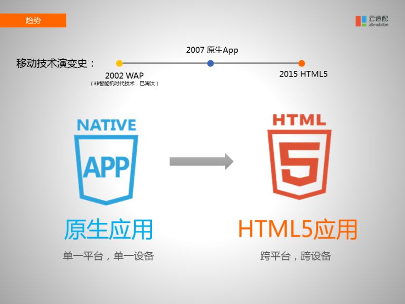 大家可以看到這個(gè)圖上有一個(gè)移動(dòng)技術(shù)的演變史,大家可能都知道在2000年初的時(shí)候有一個(gè)WAP技術(shù),功能機(jī)的時(shí)代就能上網(wǎng),那是一個(gè)非常簡化版本的移動(dòng)互聯(lián)網(wǎng)標(biāo)準(zhǔn),只能看看非常簡單的圖片和文字。到了2007年,IPHONE等智能手機(jī)發(fā)布,蘋果提出了"APP"概念,使得移動(dòng)互聯(lián)網(wǎng)相比WAP的用戶體驗(yàn)有了顯著的提升。APP也叫原生應(yīng)用,它只是為了一個(gè)單一的平臺設(shè)計(jì)的,當(dāng)時(shí)蘋果提出APP的時(shí)候只是為了自己的IOS系統(tǒng),它開發(fā)的所有APP也只能在IOS系統(tǒng)上應(yīng)用。后來GOOGLE也提出了自己安卓系統(tǒng)的APP標(biāo)準(zhǔn)、微軟也提出了自己WINDOWS手機(jī)上的 APP標(biāo)準(zhǔn)。總之,每個(gè)操作系統(tǒng)的廠商都提出了自己APP的標(biāo)準(zhǔn),這就導(dǎo)致了不同平臺開發(fā)不同的APP這樣的格局。而且當(dāng)時(shí)APP的提出只是為了手機(jī)設(shè)計(jì)的,如果你還要開發(fā)IPAD的話,要重新開發(fā)。所以簡單來說,APP原生應(yīng)用是為了單一平臺、單一應(yīng)用而設(shè)計(jì)的。所以后來W3C也看到這個(gè)問題的存在,計(jì)劃推出下一代的HTML5標(biāo)準(zhǔn)技術(shù),HTML5能夠讓你開發(fā)的應(yīng)用橫跨所有的平臺、橫跨所有的設(shè)備。