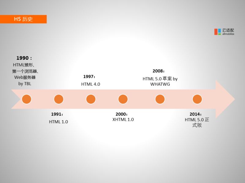 這是一個(gè)HTML發(fā)展的整個(gè)歷史。大家也可以看到世界上第一個(gè)互聯(lián)網(wǎng)雛形是1990年由歐洲一叫TBL的人提出來的。這個(gè)技術(shù)很快在科研領(lǐng)域得到了認(rèn)可。在1991年,TML把HTML技術(shù)寫成了一個(gè)正式的標(biāo)準(zhǔn)文檔,就是當(dāng)時(shí)的HTML1.0。很快,互聯(lián)網(wǎng)技術(shù)迅速從科研領(lǐng)域蔓延到民用領(lǐng)域和商業(yè)領(lǐng)域。尤其在1994年的時(shí)候,網(wǎng)景公司開發(fā)了世界上第一個(gè)商用瀏覽器,極大程度促進(jìn)了老百姓對互聯(lián)網(wǎng)的使用。隨后,微軟馬上也開發(fā)了IE瀏覽器。從1994年到1997年,網(wǎng)景瀏覽器和IE瀏覽器之間發(fā)生了激烈的瀏覽器大戰(zhàn),這也極大的促進(jìn)了HTML標(biāo)準(zhǔn)的進(jìn)步。很快,HTML進(jìn)步了幾個(gè)版本,到1997年進(jìn)步到HTML4.0 。當(dāng)然,大家都知道,最后的結(jié)局是IE瀏覽器徹底打敗了網(wǎng)景瀏覽器,搶走了所有瀏覽器的市場份額,所以在IE5.5版本發(fā)布之后,基本IE瀏覽器就是一枝獨(dú)秀了。之后HTML標(biāo)準(zhǔn)就進(jìn)入了很長一段時(shí)間的平靜期。這個(gè)時(shí)候W3C覺得當(dāng)時(shí)的HTML設(shè)計(jì)的不夠完善,所以在2000年的時(shí)候提出了XHTML,這個(gè)版本比原版HTML語法要嚴(yán)格很多,也加入了語義的元素進(jìn)去??上У氖牵^去的HTML4.0已經(jīng)根深蒂固了,很難使得整個(gè)互聯(lián)網(wǎng)向XHTML遷移。最后W3C發(fā)現(xiàn)了XHTML很難推,又恰逢蘋果發(fā)布了智能手機(jī),整個(gè)市場對新一代HTML有強(qiáng)烈的需求。在2008年HTML聯(lián)合了另一個(gè)民間組織,發(fā)布了HTML5.0的草案。