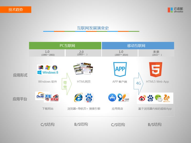 導(dǎo)致從WINDOWS軟件到HTML網(wǎng)頁的變遷的核心推動(dòng)力就是當(dāng)時(shí)的帶寬。在2000初的時(shí)候,中國開始大規(guī)模的布寬帶,早期撥號上網(wǎng)的年代網(wǎng)絡(luò)速度很慢,大家都傾向于下載軟件放在桌面上,在沒有網(wǎng)絡(luò)的時(shí)候也能使用,但是當(dāng)寬帶逐漸普及的時(shí)候,只要打開瀏覽器直接輸入網(wǎng)址就能找到想要的信息,沒有必要下載軟件了。這樣網(wǎng)頁就取代了軟件。去年中國的4G牌照下發(fā),三大運(yùn)營商都開始大規(guī)模的普及4G,這個(gè)4G就有點(diǎn)像當(dāng)年的寬帶,網(wǎng)絡(luò)帶寬大幅度提升,資費(fèi)大幅度降低?,F(xiàn)在李總理也強(qiáng)調(diào)要降低網(wǎng)絡(luò)資費(fèi)。這樣的大的歷史環(huán)境的催生下,APP客戶端的形式也會重復(fù)當(dāng)年P(guān)C互聯(lián)網(wǎng)的歷史,向HTML5網(wǎng)頁形式轉(zhuǎn)變。