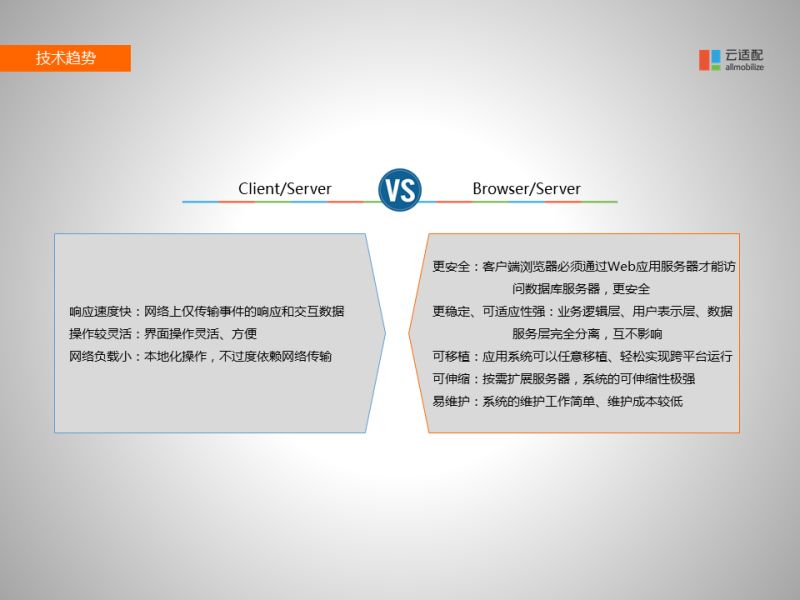 從C/S與B/S的對比圖可以看出,APP對比HTML5在響應(yīng)速度、網(wǎng)絡(luò)依賴的不同。另外我想補(bǔ)充的是,一是B/S結(jié)構(gòu)相對更加安全。因?yàn)楹诳秃苋菀自L問你本地的客戶端,很多數(shù)據(jù)處理邏輯都在客戶端里,很容易被黑客竊??;如果是B/S結(jié)構(gòu)的話,你所有的計(jì)算都在服務(wù)器端,別人是很難竊取你的商業(yè)機(jī)密的。第二,客戶端軟件很容易中病毒的。你發(fā)出去的APP可能被黑客重新打包、接入病毒再傳播出去。比如政務(wù)辦公APP,可能被黑客打包加入病毒再發(fā)布到應(yīng)用商店里去,老百姓在應(yīng)用APP的時(shí)候,所有的行為都可以監(jiān)控到,包括核心支付、個(gè)人信息等,都會被黑客竊取。因?yàn)锽/S結(jié)構(gòu)的網(wǎng)址是唯一的,黑客是不可能偽造的,比如中國政府網(wǎng)的網(wǎng)址是www.gov.cn ,老百姓知道這個(gè)網(wǎng)址一定是到達(dá)中國政府網(wǎng),這就避免了被重新打包的危險(xiǎn)。三是,B/S結(jié)構(gòu)維護(hù)起來也非常簡單。很多時(shí)候要升級服務(wù)器端的產(chǎn)品,但如果用戶不升級其APP的話,你還需要保留一份老版本的APP,才能讓其繼續(xù)使用,這個(gè)維護(hù)成本是非常高的,而B/S結(jié)構(gòu)的話,用戶訪問到的永遠(yuǎn)是最新版,不用擔(dān)心兼容性的問題。四是操作系統(tǒng)每次升級,APP都要同樣升級,而B/S結(jié)構(gòu)則不會有這個(gè)問題,所以維護(hù)的工作量會降低很多。