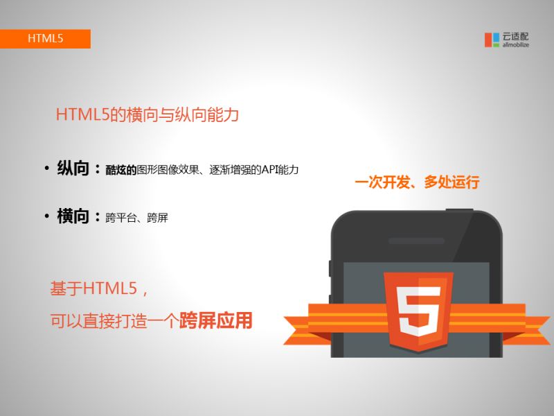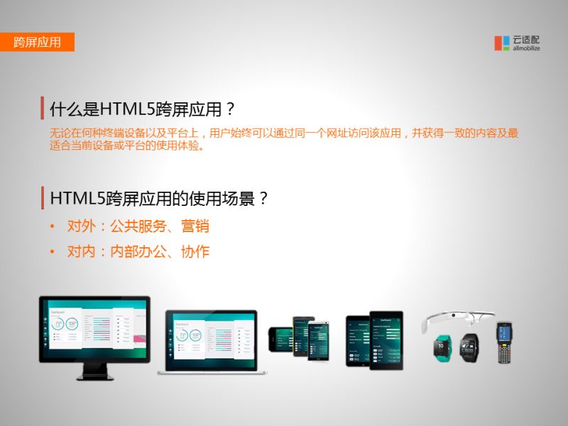 H5它的特性可以歸納成兩個(gè)方向:橫向和縱向。縱向就是有更酷炫的圖像效果,可以做出很豐富的交互界面的應(yīng)用,有很多的增強(qiáng)API可以讓你訪問攝像頭、GPS。橫向就是跨平臺、跨屏,一次開發(fā)可以運(yùn)行到很多地方,各種這樣的設(shè)備上。云適配就是致力于幫您打造HTML5跨屏應(yīng)用,對外讓老百姓無論使用什么設(shè)備、什么平臺,始終可以通過同一個(gè)網(wǎng)址訪問到您的網(wǎng)站,來完成政務(wù)辦公系統(tǒng)。對內(nèi)移動(dòng)辦公協(xié)同系統(tǒng)上,每個(gè)人的手機(jī)、平臺都不一樣,用HTML5也是非常高效的。