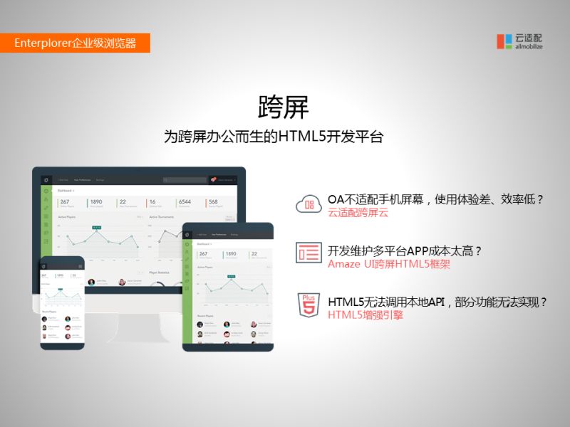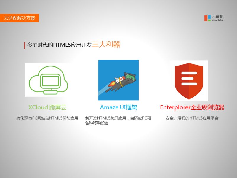 針對HTML5跨屏應(yīng)用的需求,云適配提供了三大產(chǎn)品線。一是XCLOUD跨屏云,能夠幫把現(xiàn)有的PC網(wǎng)站直接轉(zhuǎn)化成HTML5的移動(dòng)應(yīng)用,直接實(shí)現(xiàn)跨屏。二是 AMAZE UI框架,這個(gè)框架開發(fā)出的HTML5應(yīng)用自動(dòng)適應(yīng)PC和各種移動(dòng)設(shè)備。第三個(gè)是瀏覽器,是用來運(yùn)行HTML5應(yīng)用,它為HTML5提供一個(gè)增強(qiáng)的、安全的運(yùn)行平臺,主要適用于移動(dòng)辦公的環(huán)境。