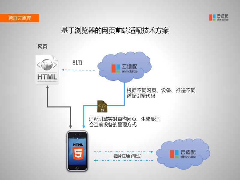 從跨屏云的工作原理可以看出,它是一個(gè)純前端的解決方案,不涉及后臺的東西,只要在網(wǎng)站前端加一串代碼,不需要原來PC網(wǎng)站的代碼和數(shù)據(jù)庫,這是非常安全的。用戶在用手機(jī)訪問原來網(wǎng)站的時(shí)候,因?yàn)榫W(wǎng)頁里加了云適配的代碼,手機(jī)瀏覽器就會加載這個(gè)代碼,從云端下載一個(gè)適配引擎,適配引擎會對當(dāng)前的網(wǎng)頁做出重新的排版,轉(zhuǎn)化成HTML5移動(dòng)應(yīng)用的效果。同時(shí)我們還提供圖片壓縮功能,可以大幅度增加下載速度。根據(jù)統(tǒng)計(jì)可以把圖片壓縮到原來的20%,也就是流量可以節(jié)省到原來的1/5,這也是非常有效果的。