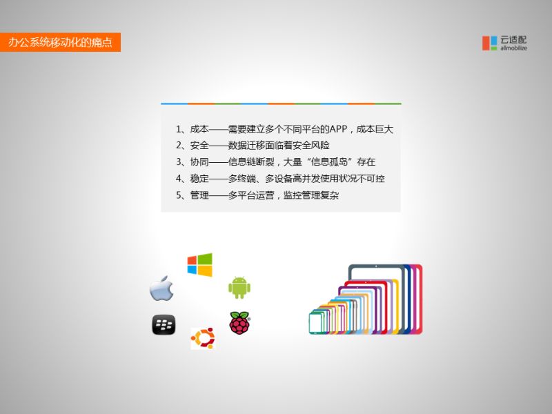 今天辦公系統(tǒng)移動(dòng)化的幾個(gè)痛點(diǎn):一是成本。需要為不同的平臺開發(fā)不同的APP成本非常大。二是很多政府、企業(yè)都會找第三方公司開發(fā)APP,這就需要政府開放數(shù)據(jù)庫接口、PC網(wǎng)站系統(tǒng)給他,這里會面臨數(shù)據(jù)泄露的問題,以及在開發(fā)、遷移過程中可能會導(dǎo)致現(xiàn)有的PC系統(tǒng)無法工作。三是開發(fā)的APP之間都是孤島,無法相互連接;四是穩(wěn)定性。不同員工手機(jī)上APP版本不同,在訪問現(xiàn)有系統(tǒng)的同時(shí)要考慮到不同的版本切換問題,對開發(fā)造成困難。同時(shí)要管理不同的平臺,管理系統(tǒng)也是非常復(fù)雜的。