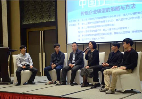 接下來進(jìn)行的是主題為《傳統(tǒng)企業(yè)互聯(lián)網(wǎng)轉(zhuǎn)型的策略與方法》的對話主題環(huán)節(jié)。對話環(huán)節(jié)由北大信息化與信息管理研究中心秘書長、北大CIO班教務(wù)辦主任姚樂主持,上海電氣集團(tuán)股份有限公司CIO、第八屆北大CIO班學(xué)員、上海CIO聯(lián)盟執(zhí)行理事長李靜,上海通用互聯(lián)網(wǎng)新技術(shù)高級經(jīng)理向騫,蘇州未來電器CIO、第二十屆北大CIO班學(xué)員陳桂平,新城集團(tuán)互聯(lián)網(wǎng)公司副總經(jīng)理、首屆北大互聯(lián)網(wǎng)+研修班學(xué)員從申,億方云創(chuàng)始人&CEO程遠(yuǎn)參與了對話研討,從自身企業(yè)角度紛紛發(fā)表自己關(guān)于互聯(lián)網(wǎng)轉(zhuǎn)型的策略與方法的不同見解,并積極回復(fù)現(xiàn)場嘉賓的提問,使現(xiàn)場氣氛達(dá)到新的高潮。