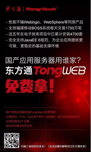 恰逢建國(guó)67周年華誕,9月20日,東方通正式啟動(dòng)“國(guó)產(chǎn)服務(wù)器用誰(shuí)家?東方通TongWeb免費(fèi)拿”活動(dòng)。此活動(dòng)是面向全國(guó)政府、行業(yè)、企業(yè)用戶,免費(fèi)提供東方通企業(yè)級(jí)商用應(yīng)用服務(wù)器產(chǎn)品TongWeb6,通過(guò)試用與比較,進(jìn)而替換國(guó)外品牌同類中間件產(chǎn)品的活動(dòng)。