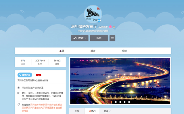 《2015年人民日?qǐng)?bào)?政務(wù)指數(shù)微博影響力報(bào)告》顯示,深圳在城市政務(wù)微博競(jìng)爭(zhēng)力十強(qiáng)榜中位列第四。其中,“深圳天氣”蟬聯(lián)全國(guó)氣象類(lèi)政務(wù)微博第一名,“深圳微博發(fā)布廳”躋身全國(guó)十大黨政新聞發(fā)布微博,“深圳交警”“深圳公安”入全國(guó)十大公安系統(tǒng)微博,“深圳教育”進(jìn)入全國(guó)十大教育系統(tǒng)微博。