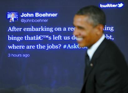 有意思的是,利用推特這個平臺,奧巴馬還與政治對手來了一次網(wǎng)上交鋒。因?yàn)槠渲杏幸粋€問題來自眾議院議長博納,博納問道:“在經(jīng)歷了創(chuàng)紀(jì)錄的政府支出之后,我們的負(fù)債更多,但工作在哪里?”奧巴馬上臺之后推出經(jīng)濟(jì)刺激計(jì)劃,擴(kuò)大政府開支,稱此舉可以創(chuàng)造更多就業(yè)崗位。對此,奧巴馬的回答是:“這個問題有點(diǎn)歪曲事實(shí)。”他指出當(dāng)前勞動力市場正在復(fù)蘇,盡管創(chuàng)造就業(yè)崗位的速度還不是很快。