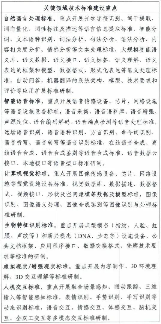 ?。抨P(guān)鍵領(lǐng)域技術(shù)標(biāo)準(zhǔn)主要圍繞自然語言處理、智能語音、計算機(jī)視覺、生物特征識別、虛擬現(xiàn)實/增強(qiáng)現(xiàn)實、人機(jī)交互等方面,為人工智能應(yīng)用提供領(lǐng)域技術(shù)支撐;