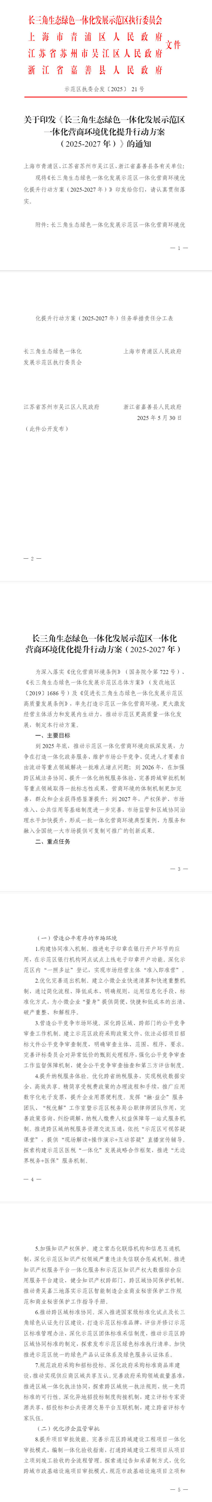 近日,長三角生態(tài)綠色一體化發(fā)展示范區(qū)執(zhí)行委員會聯(lián)合青浦區(qū)、吳江區(qū)、嘉善縣人民政府聯(lián)合印發(fā)《長三角生態(tài)綠色一體化發(fā)展示范區(qū)一體化營商環(huán)境優(yōu)化提升行動方案(2025-2027年)》(以下簡稱“行動方案”)。