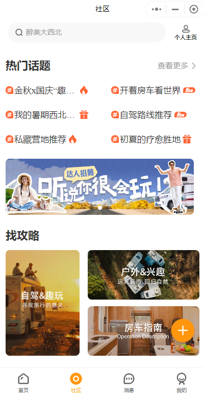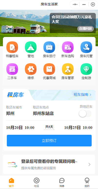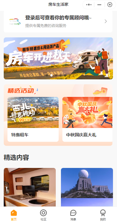 而在用戶非常注重的服務(wù)方面,房車生活家房車租賃app非常到位,讓初次體驗房車的用戶也能無憂出行,最重要的是房車生活家的門店服務(wù)人員會實施“一客一洗一消毒”,讓提車用戶放心出行,并且會為房車出租用戶提供細致周到的用車培訓,讓第 一次駕駛房車的用戶就能輕松出發(fā)。而房車生活家最吸引大家的點是好玩。自成立以來,房車生活家已經(jīng)成功打造多個房車旅行目的地IP,定制設(shè)計策劃數(shù)百條房車文旅產(chǎn)品,涵蓋親子、寵物、長者、情侶等主題;為各類大型主題活動如電影節(jié)、音樂節(jié)、旅游節(jié)、體育賽事、藝術(shù)節(jié)等提供活動用車服務(wù)。