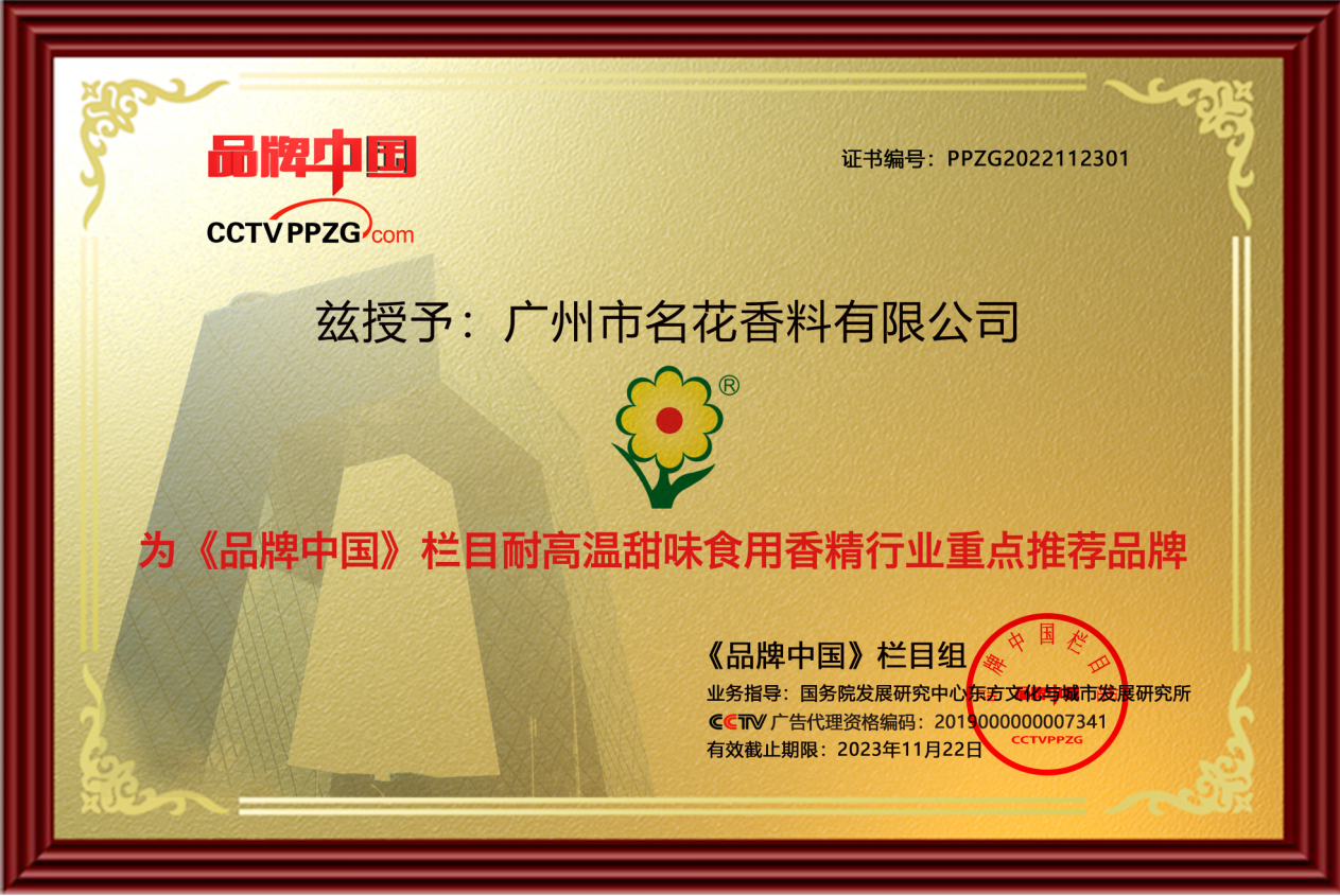 名花香料在國內(nèi)外有良好的人文氛圍和品牌口碑,2022年獲得《品牌中國》欄目重點(diǎn)推薦品牌,名花香料秉承以人為本、持續(xù)改進(jìn)、品質(zhì)卓越、真誠服務(wù)的品牌理念獲得行業(yè)客戶的青睞。