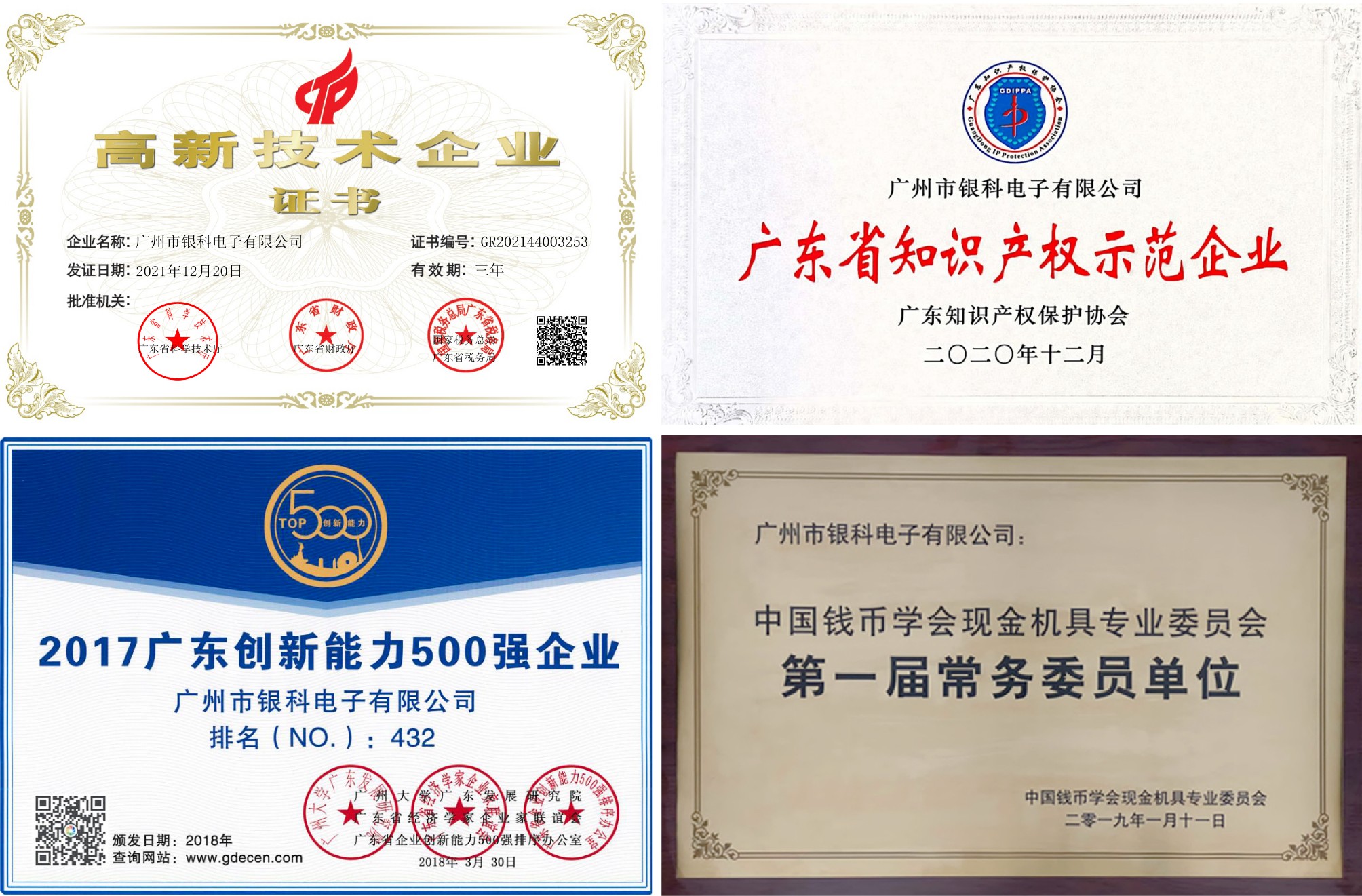 憑借突出的技術創(chuàng)新能力,銀科2018年入選為“廣東企業(yè)創(chuàng)新能力500強企業(yè)”、“瞪羚企業(yè)”,同年當選為中國人民銀行直屬的“中國錢幣學會現(xiàn)金機具專業(yè)委員會”常務委員單位,公司董事長當選為“中國錢幣學會現(xiàn)金機具專業(yè)委員會”第 一屆專家委員。2020年公司榮獲“廣東省知識產(chǎn)權示范企業(yè)”。