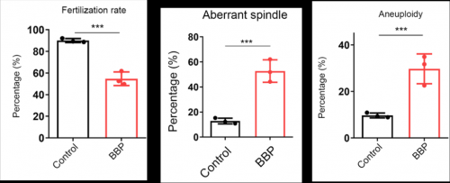 非整倍性染色體數(shù)量異常是流產(chǎn)和發(fā)育障礙的主要原因。非整倍性被認(rèn)為是卵母細(xì)胞衰老的標(biāo)志,因?yàn)樗S著年齡的增長(zhǎng)而增加50%。導(dǎo)致非整倍體的衰老卵母細(xì)胞的另一個(gè)特征是紡錘體不良幫助平均分裂染色體的蛋白質(zhì)組織。研究人員發(fā)現(xiàn),來自BBP暴露小鼠的卵母細(xì)胞增加了紡錘體紊亂和非整倍性。