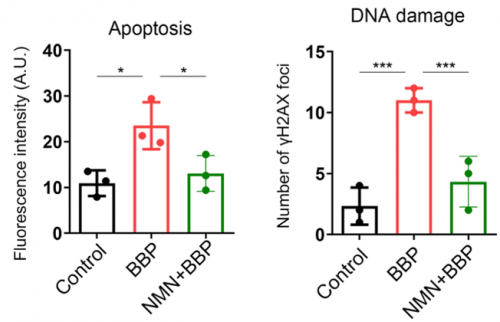 隨著年齡的增長(zhǎng),氧化應(yīng)激會(huì)導(dǎo)致DNA損傷,積累并導(dǎo)致進(jìn)一步的減少,從而加劇衰老。此外,當(dāng)受損線粒體的電壓達(dá)到特定閾值時(shí),細(xì)胞死亡被激活。研究人員發(fā)現(xiàn),BBP暴露小鼠的卵母細(xì)胞中細(xì)胞死亡和DNA損傷均增加。此外,NMN防止了這兩種老化特征的發(fā)生。