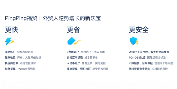針對(duì)外貿(mào)企業(yè)經(jīng)常遇到的收款慢、費(fèi)用高、到賬時(shí)間長(zhǎng),無(wú)法滿足發(fā)貨時(shí)效,訂單很容易付之東流等問(wèn)題。PingPong福貿(mào)為外貿(mào)企業(yè) 0 費(fèi)用當(dāng)天開(kāi)通全球收款賬戶、歐美本地收款賬戶,最 快實(shí)時(shí)到賬。同時(shí)還可以幫助企業(yè)合規(guī)申報(bào),實(shí)時(shí)查看資金動(dòng)向,有效規(guī)避風(fēng)險(xiǎn)。