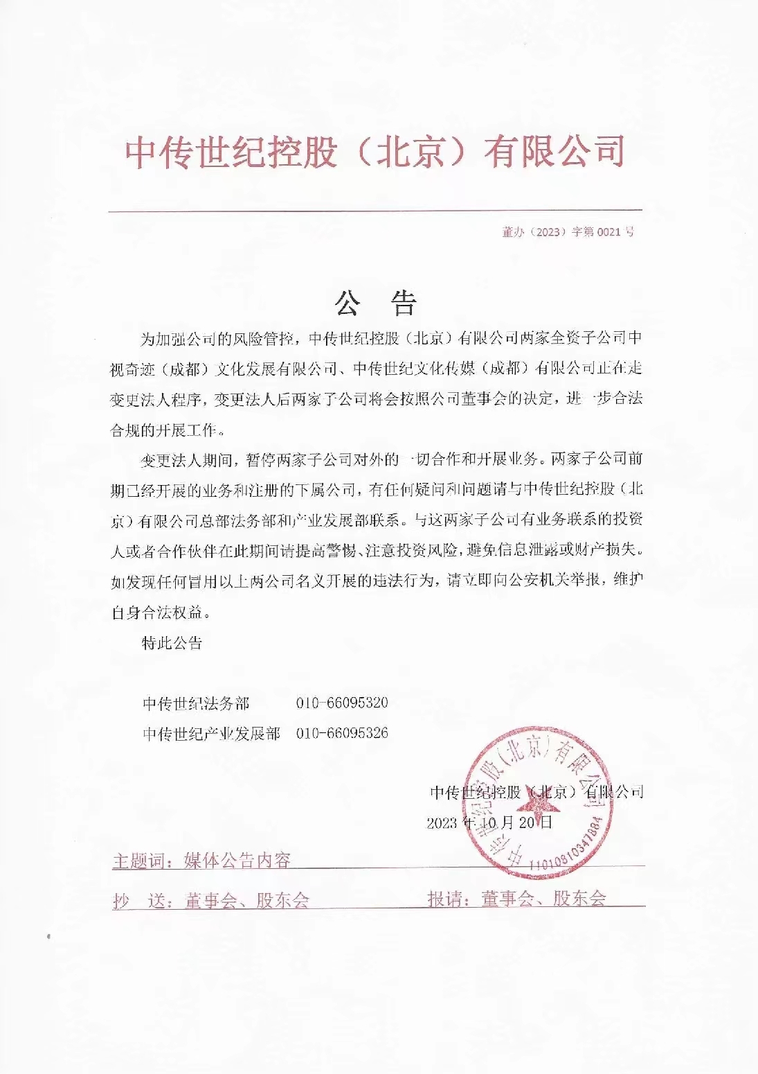 變更法人期間,暫停兩家子公司對(duì)外的一切合作和開展業(yè)務(wù)。兩家子公司前期已經(jīng)開展的業(yè)務(wù)和注冊的下屬公司,有任何疑問和問題請(qǐng)與中傳世紀(jì)控股(北京)有限公司總部法務(wù)部和產(chǎn)業(yè)發(fā)展部聯(lián)系。與這兩家子公司有業(yè)務(wù)聯(lián)系的投資人或者合作伙伴在此期間請(qǐng)?zhí)岣呔?、注意投資風(fēng)險(xiǎn),避免信息泄露或財(cái)產(chǎn)損失。如發(fā)現(xiàn)任何冒用以上兩公司名義開展的違 法行為,請(qǐng)立即向公安機(jī)關(guān)舉報(bào),維護(hù)自身合法權(quán)益。