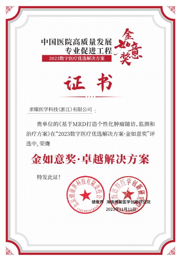 2023年11月11日,由健康界、海南博鰲醫(yī)學(xué)創(chuàng)新研究院和中國醫(yī)藥教育協(xié)會數(shù)字醫(yī)療專業(yè)委員會聯(lián)合主辦的第三屆“金如意獎”數(shù)字醫(yī)療優(yōu)選解決方案評選頒獎典禮,在2023中國醫(yī)院管理年會上揭曉榜單并頒獎。求臻醫(yī)學(xué)MRD產(chǎn)品解決方案榮獲第三屆金如意獎最 高獎項——卓越獎,這是對公司在臨床科研和轉(zhuǎn)化醫(yī)學(xué)領(lǐng)域的杰出貢獻的肯定。
