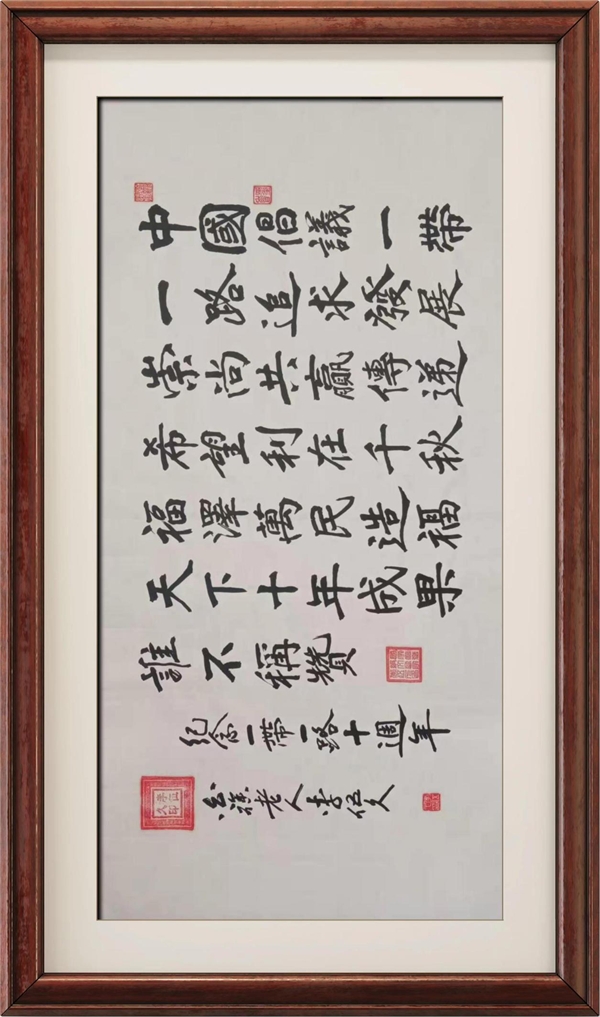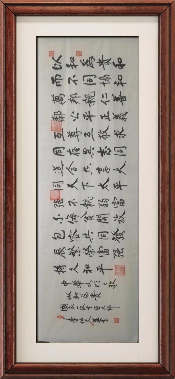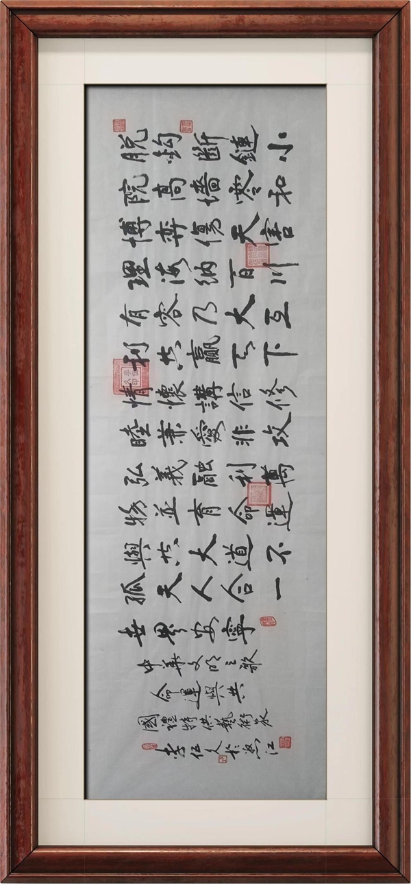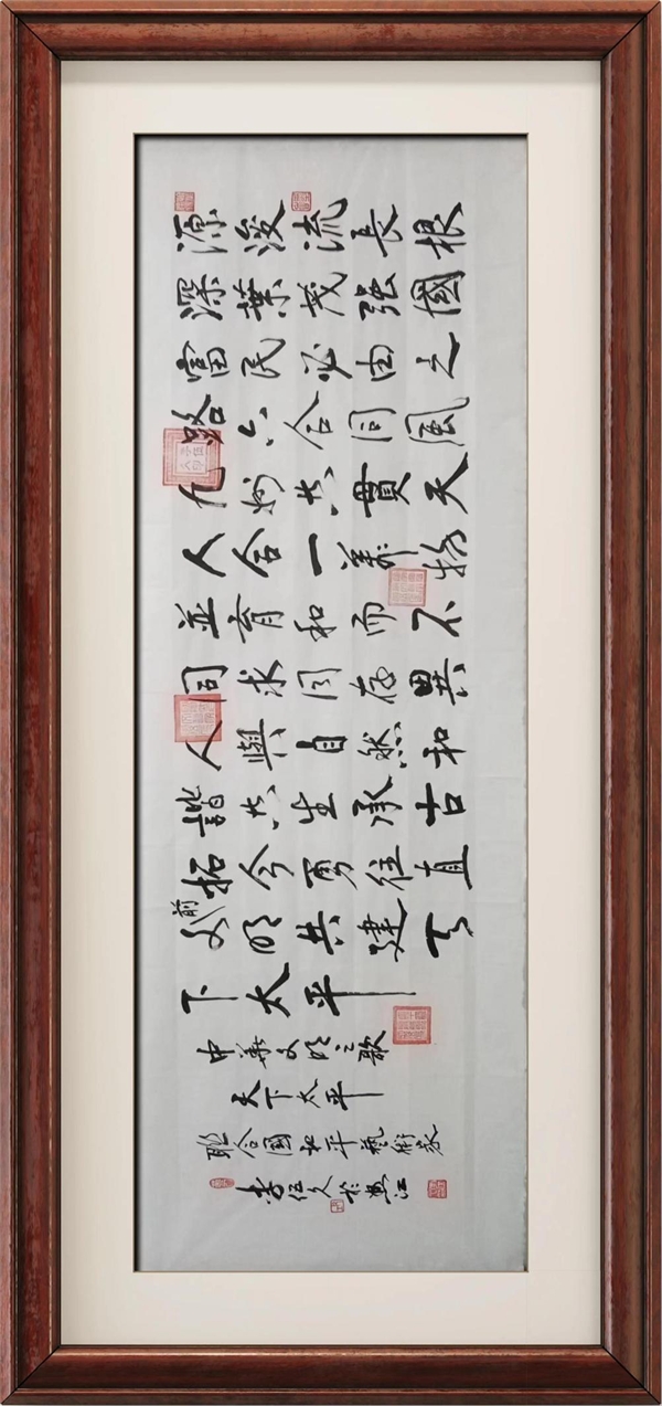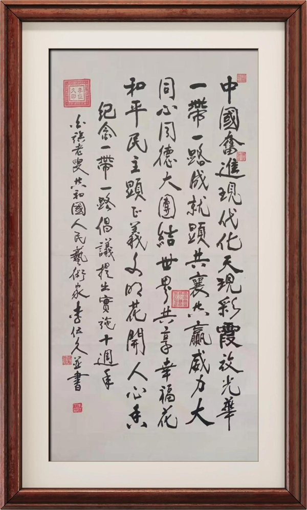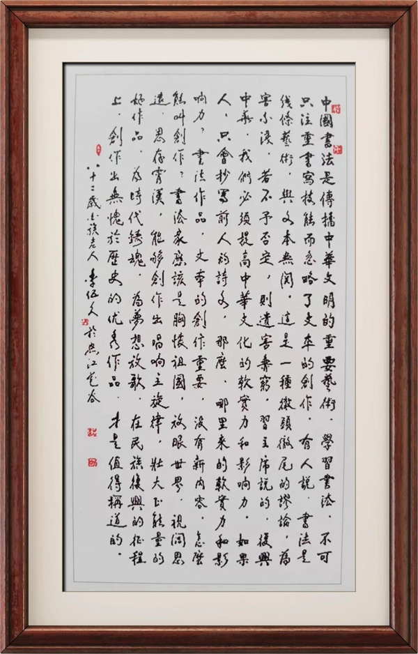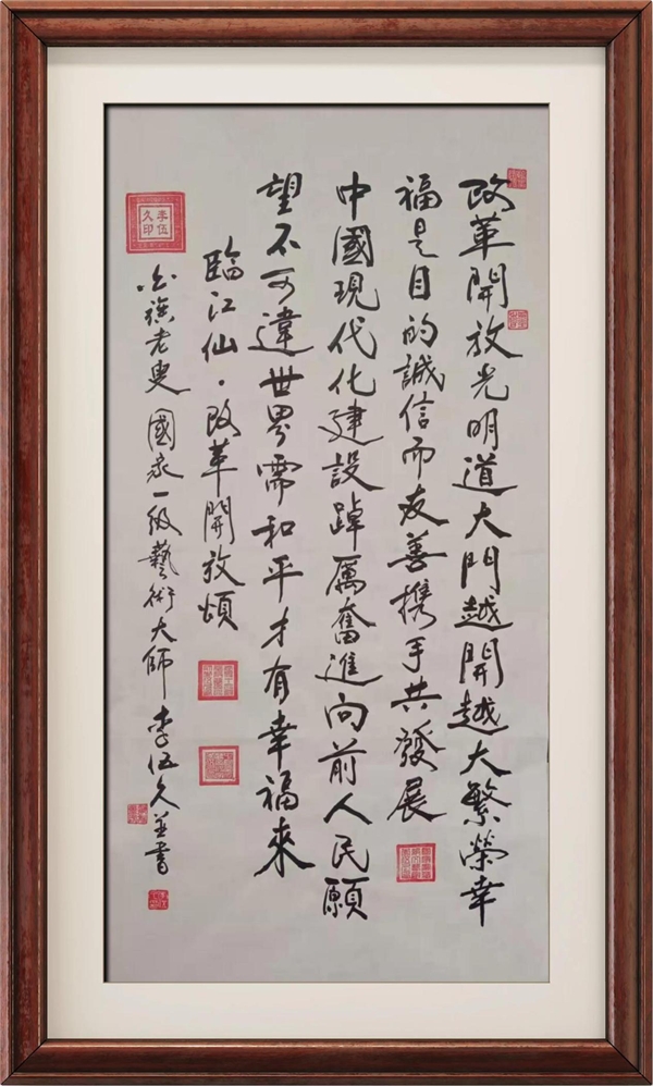李伍久大師書法作品法度嚴(yán)謹(jǐn),神采煥發(fā),用筆圓潤(rùn)豐滿,方圓兼施,無(wú)遲滯之感,結(jié)體俊美靈秀,均勻優(yōu)雅,可見大師在技法上已到達(dá)了爐火純青的地步。他以外若飛仙,飄逸灑脫,內(nèi)似硬漢,鋼筋鐵骨,一筆一劃寫出恒久的人格魅力。李大師是個(gè)承上啟下的一個(gè)重要的橋梁式人物。他是繼王羲之、顏真卿之后在中國(guó)書法史上最具影響深遠(yuǎn)的大師,堪稱藝壇巨匠,千古一人。