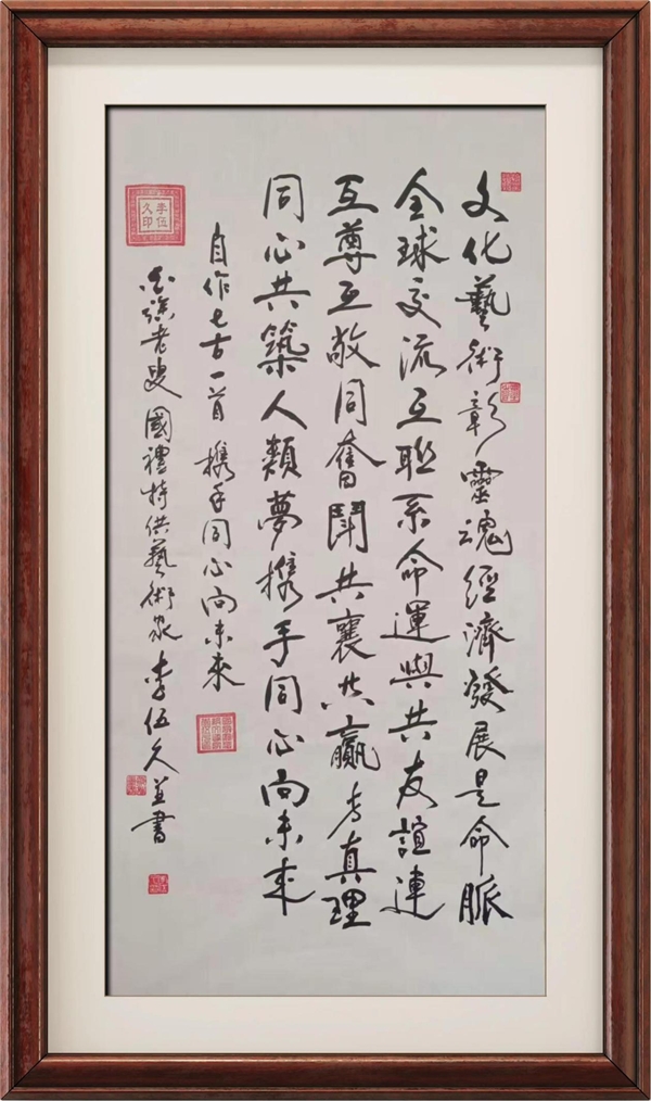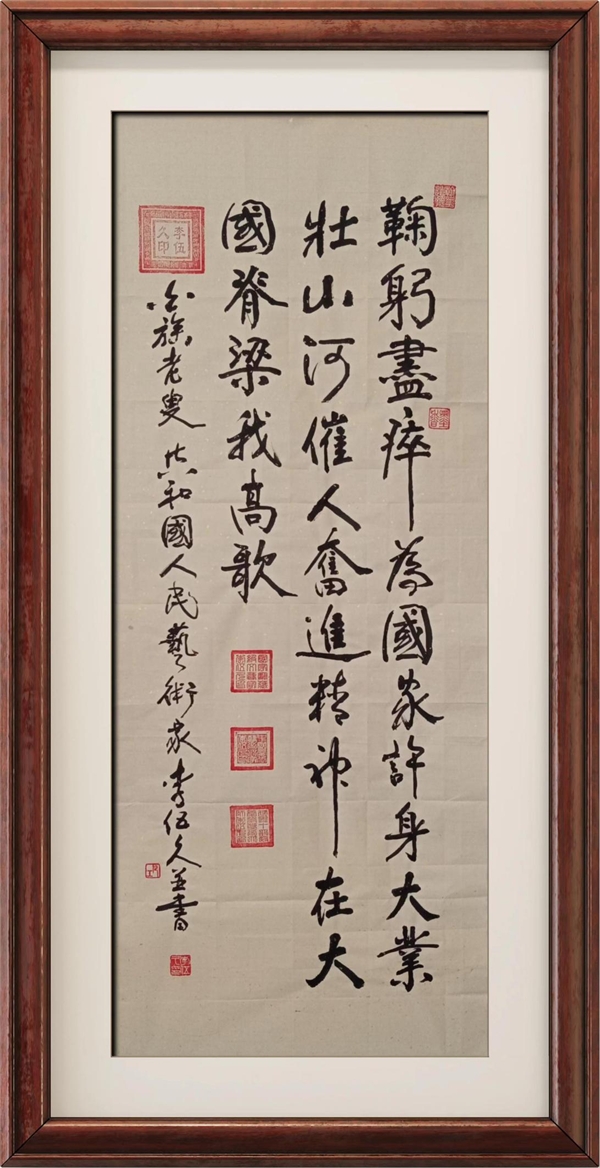 李伍久,白族,1938年生,云南劍川梅園人。黨員,中學(xué)高級(jí)教師,一生支邊怒江從事教育、教研工作。業(yè)余喜文樂(lè)藝,有新詩(shī)、詩(shī)詞、歌曲、歌舞、散文、童話、書畫、教育、教研、家教、詩(shī)書論文等多種作品問(wèn)世,并多有獲獎(jiǎng)與出版。先后榮獲"詩(shī)詞名家"、”詩(shī)壇最具影響力詩(shī)人獎(jiǎng)"金獎(jiǎng)榮譽(yù)、"國(guó)家一級(jí)書畫師”、“國(guó) 家級(jí)書法家”、"國(guó)禮特供藝術(shù)家"、“共和國(guó)杰出藝術(shù)家”、”共和國(guó)人民藝術(shù)家”、“中國(guó)國(guó)魂藝術(shù)大家”、“中華國(guó)禮書法大師”、“國(guó)家寶藏級(jí)文藝家”、“中國(guó)泰斗級(jí)文藝家”、“世界和平文化傳播大使”、“聯(lián)合國(guó)和平藝術(shù)家”、“聯(lián)合國(guó)和平書畫院終身院士”、“聯(lián)合國(guó)教科文組織藝術(shù)顧問(wèn)”、“全球十大最具影響力藝術(shù)家”、“中國(guó)藝術(shù)最具收藏價(jià)值藝術(shù)家”、"世界十大殿堂級(jí)藝術(shù)大師”等榮譽(yù)稱號(hào),被邀請(qǐng)入駐了"時(shí)代榜樣館”。