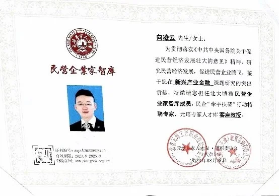 為貫徹落實(shí)《關(guān)于促進(jìn)民營(yíng)經(jīng)濟(jì)發(fā)展壯大的意見》精神,研究民營(yíng)經(jīng)濟(jì)發(fā)展,促進(jìn)民營(yíng)企業(yè)騰飛,鑒于向凌云先生在新興產(chǎn)業(yè)金融課題研究的突出貢獻(xiàn),特邀請(qǐng)擔(dān)任北大博雅民營(yíng)企業(yè)家智庫成員,民企“牽手扶智”行動(dòng)特聘專家,元培專家人才庫客座教授。