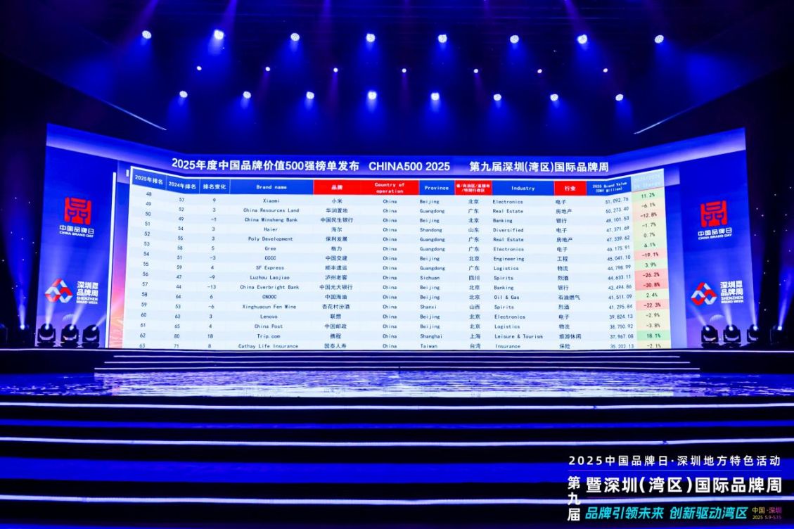 5月9日下午舉行的第九屆“深圳(灣區(qū))國際品牌周”主場活動——2025粵港澳大灣區(qū)質(zhì)量品牌峰會上,每年在達(dá)沃斯世界經(jīng)濟(jì)論壇年會上發(fā)布全球品牌價值500強(qiáng)的國際著名品牌價值評估咨詢機(jī)構(gòu)Brand Finance,聯(lián)合深圳工業(yè)總會獨(dú)家發(fā)布了“2025中國品牌價值500強(qiáng)”中英文榜單。