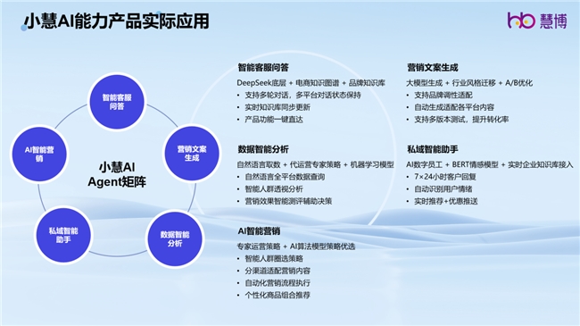 路演中,慧博團隊重點展示了小慧 AI 的五大核心能力:智能客服問答(基于大模型 + 電商知識圖譜,應(yīng)答準確率超 90%,支持多平臺對話狀態(tài)同步)、營銷文案生成(適配品牌調(diào)性,多版本 A/B 測試優(yōu)化,效率提升 10 倍)、數(shù)據(jù)智能分析(自然語言取數(shù) + 實時預警,助力商家秒級掌握經(jīng)營動態(tài))、私域智能助手(7×24 小時情感識別回復,會員復購提升 1X%)、AI 智能營銷(自動化人群圈選 + 分渠道策略推送,GMV 增長超 1XX%)。